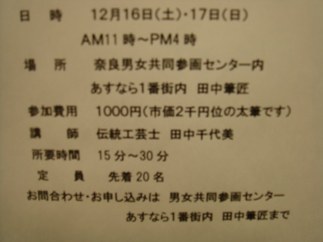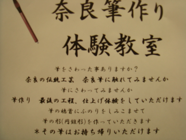 来る12月16日(土)と17日(日)の2日間、あすなら1番街の「田中筆匠」さんが、奈良筆の手作り体験を実施します